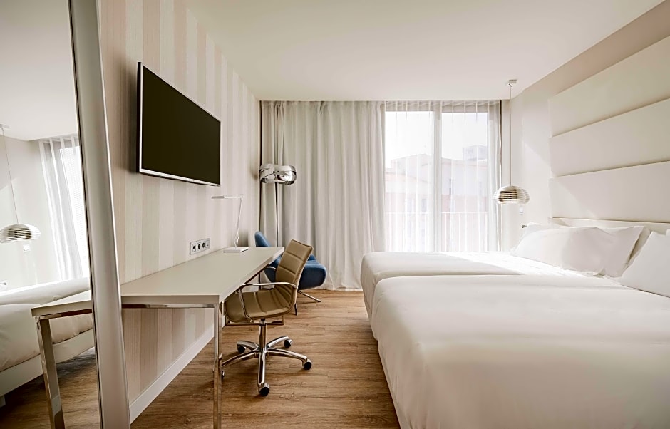 Standard room with balcony (1ad) is 215 square feet and includes 2 single beds 80-130 width plus extra beds on demand, desk, and hairdryer.